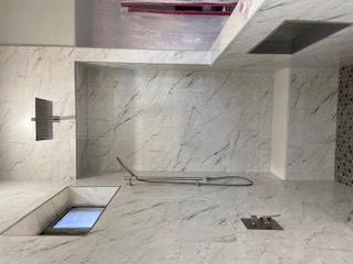 Multiple showerheads, including rainfall and body jets.